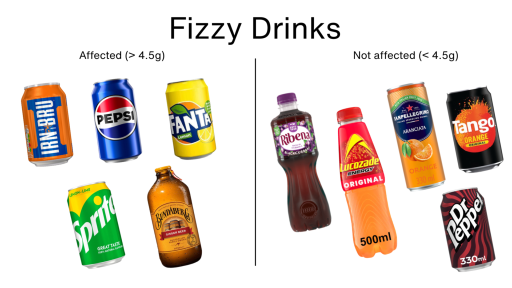 Many of the UK’s most popular sodas will also be affected. Currently, the lower tax rate of 18p per litre applies for drinks with less than 5g of sugar per 100ml.