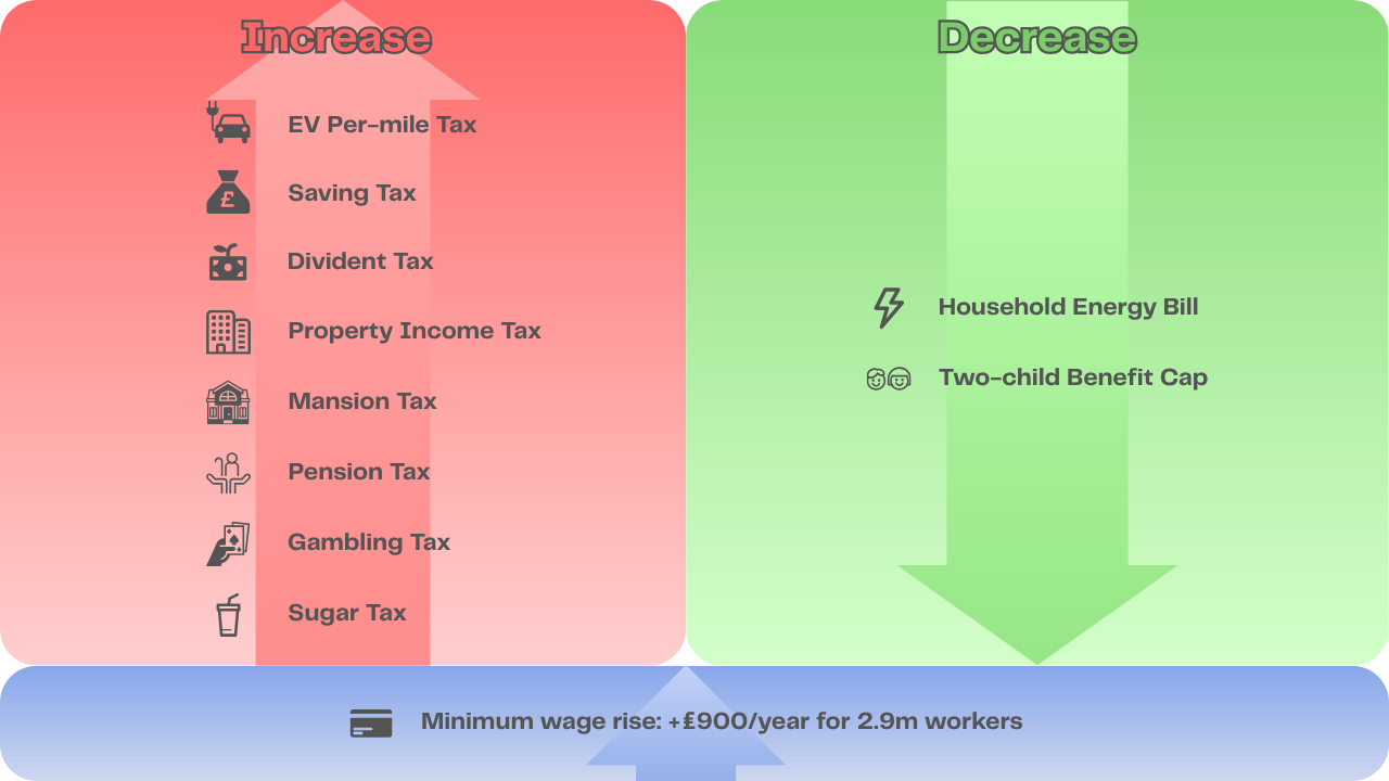 Average household energy bills are set to fall by around £150. This is the main direct financial relief in the Budget and will offset some of the increased costs elsewhere.